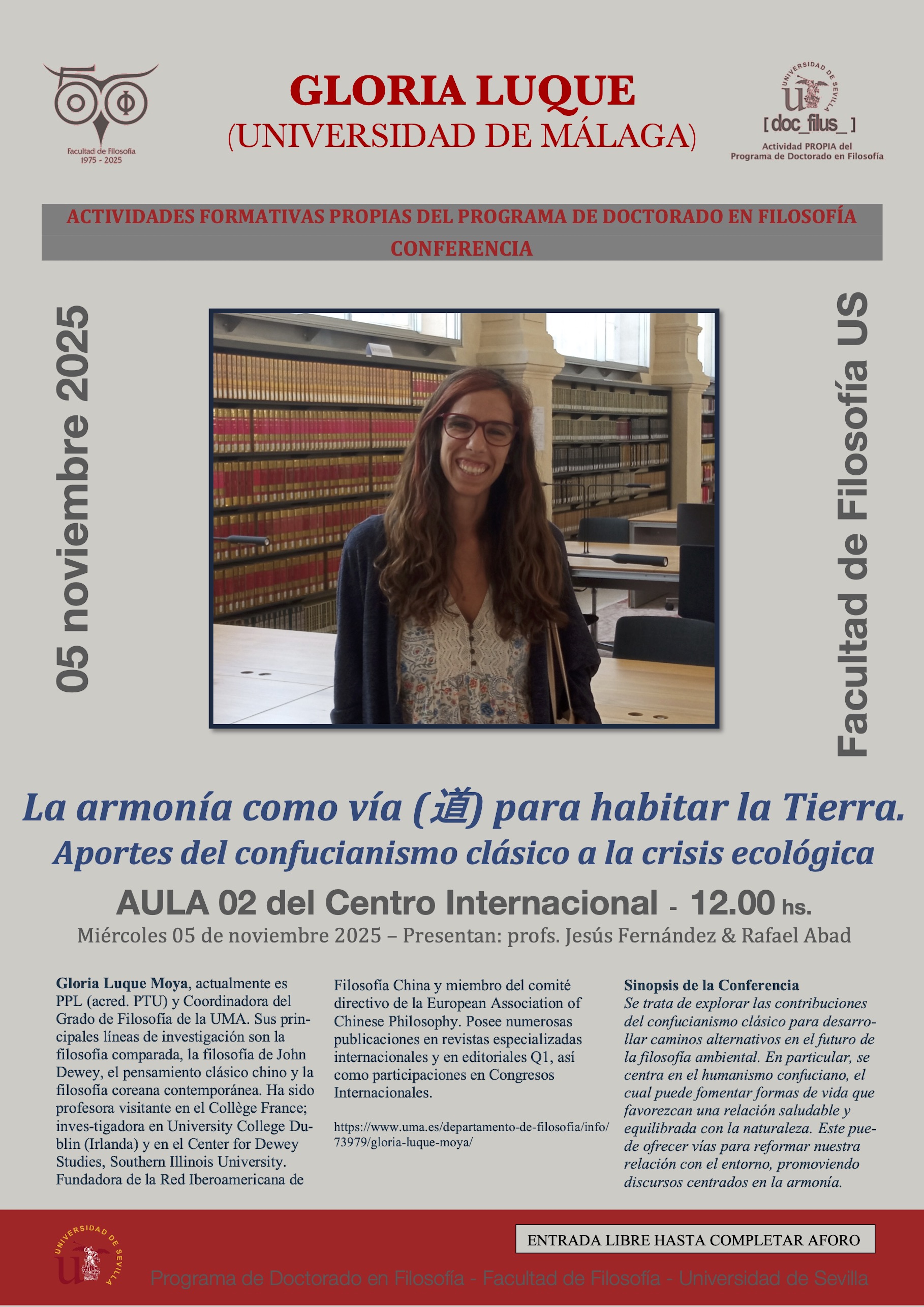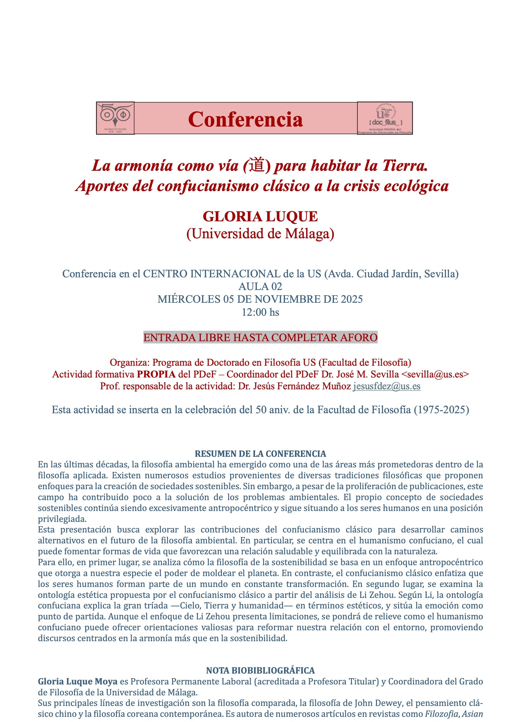 05/11/25 Confer. "La armonía como vía (道) para habitar la Tierra. Aportes del confucianismo..." - Profª Gloria Luque (UMA) - Centro Internacional US - [Actividad PROPIA del PDeF] - 50 Aniv Fac Fil - DMF 03 Nov 2025