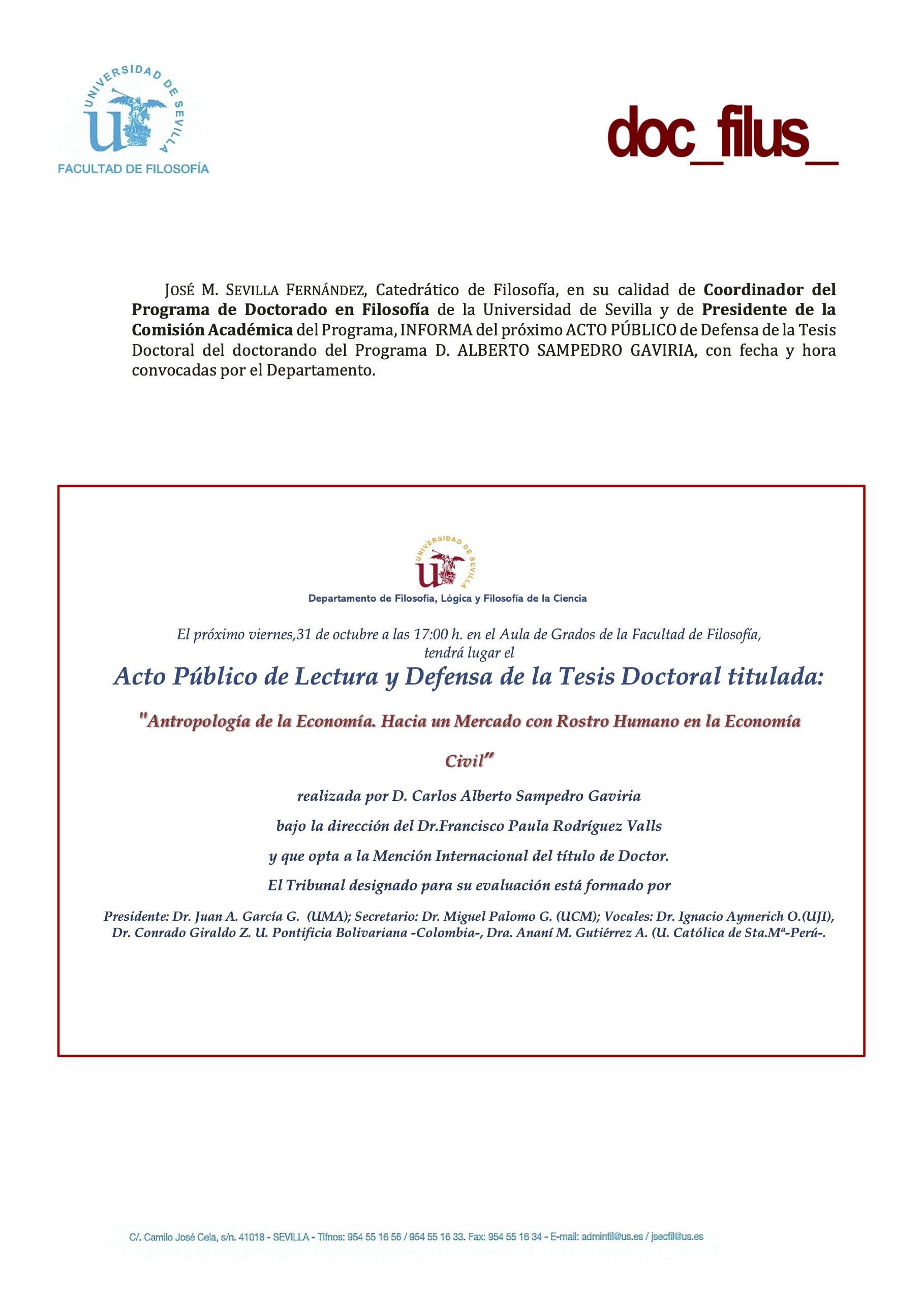 Anuncio de Defensa de Tesis Doctoral de A. SAMPEDRO GAVIRIA: 31 oct. 17.00H